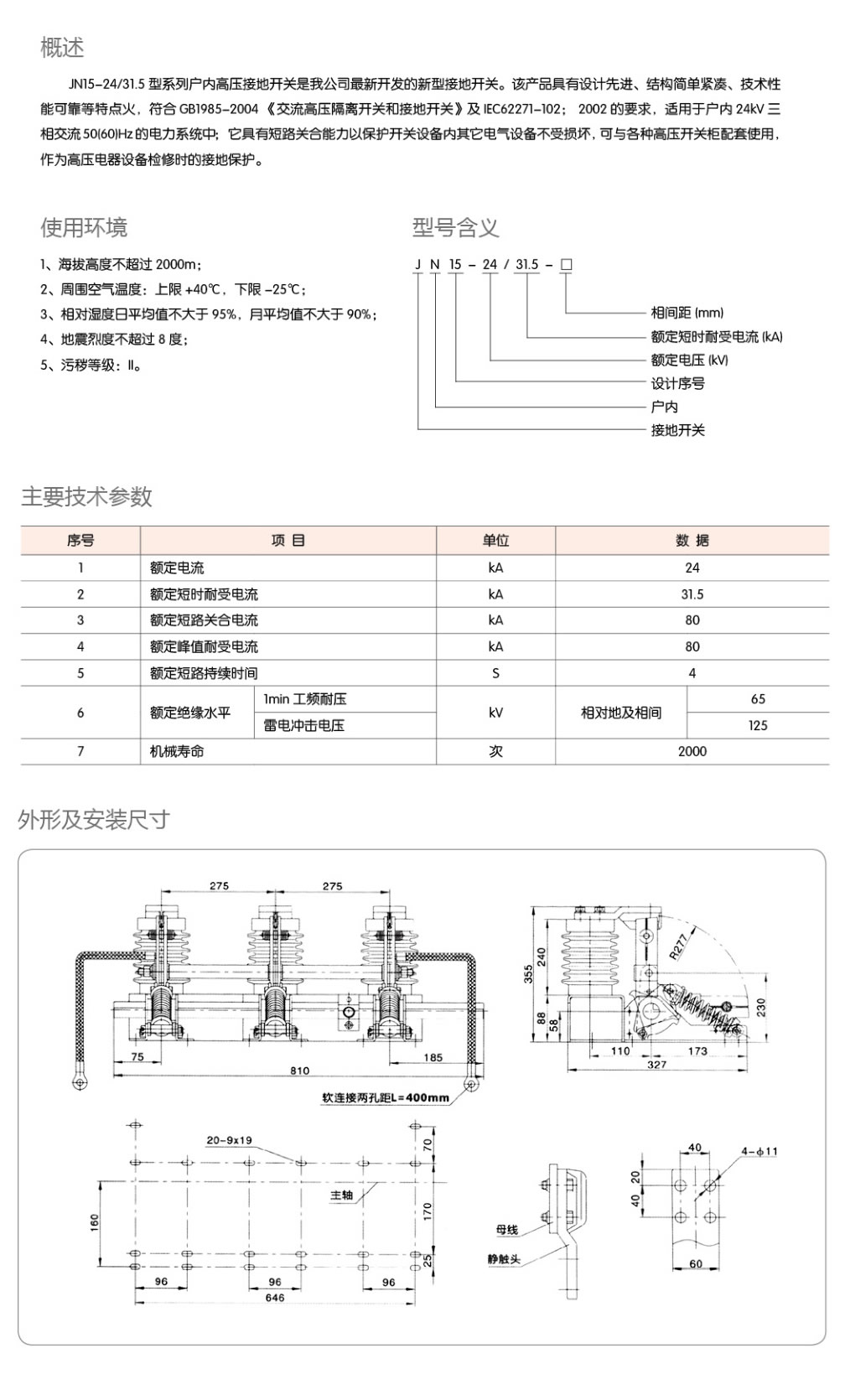 JN15-24/31.5 series indoor high voltage grounding switch is the latest new grounding switch developed by our company. This product has the characteristics of advanced design, simple and compact structure, and reliable technical performance. It is suitable for indoor 24kv three-phase AC 50 (60) Hz power system; it has short-circuit closing capability to protect other electrical equipment in the switchgear from Damaged, it can be used with various high-voltage switch cabinets as a grounding protection for high-voltage electrical equipment during maintenance.