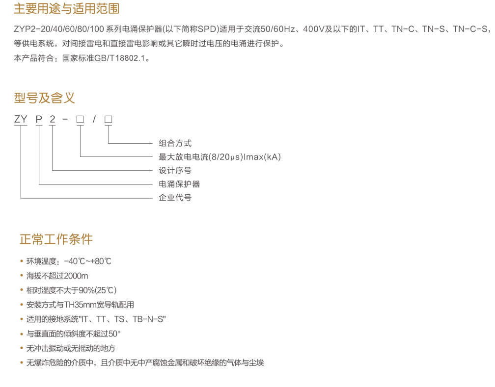 Zyp2-20 / 40 / 60 / 80 / 100 series SPD is suitable for it, TT, TN-C, TN-S, TN-C-S power supply systems of 50 / 60Hz, 400V and below to protect indirect lightning, direct lightning impact or other transient overvoltage surge.