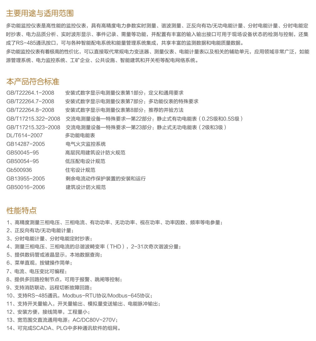Multi function monitoring instrument is a high-performance monitoring instrument, which has the functions of high-precision real-time measurement of power parameters, harmonic measurement, positive and negative active / reactive energy measurement, time-sharing energy measurement, time-sharing energy reading, power quality analysis, real-time waveform display, event recording, demand, etc, It is equipped with abundant input and output interfaces, which can be used to detect and control the status of field equipment. It also integrates RS-485 communication interface, which can be integrated with various intelligent power distribution systems and energy management systems to share abundant detection data and power quality data.